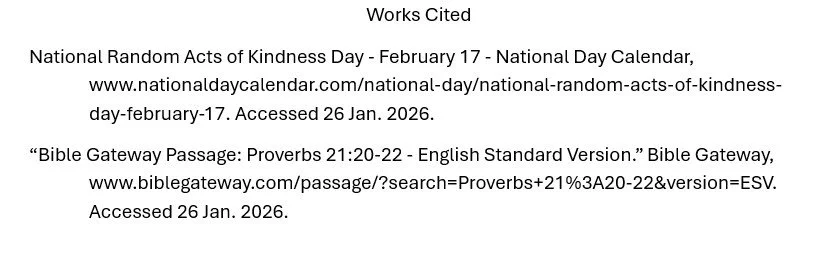 Ultimately, true kindness comes from God alone, who created us to glorify Him and then gave up His only Son to save us despite our wickedness, showing the ultimate act of love. The Bible says that God lavishes His kindness on us, and wants us to be kind as well, stating in Proverbs 21:21, “Whoever pursues righteousness and kindness will find life, righteousness, and honor” (“Bible Gateway Passage: Proverbs 21:20-22 - English Standard Version”). So, this holiday is a great way to follow in His example, treating others with love and respect and having a servant heart. Have a very happy Random Acts of Kindness Day!