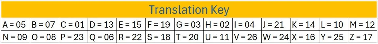 Remember, we can decipher it by looking at the numbers two at a time. If we look at them this way, we can notice that there are four pairs of numbers: 09, 05, 26, and 04. Now if we look at the helpful Translation Key that Navi found, we can see that 09 = N, 05 = A, 26 = V, and 04 = I. This means our hidden example message is NAVI. Now that you understand using a translation key, go ahead and help Navi out as he works to decipher a hint to his next adventure!