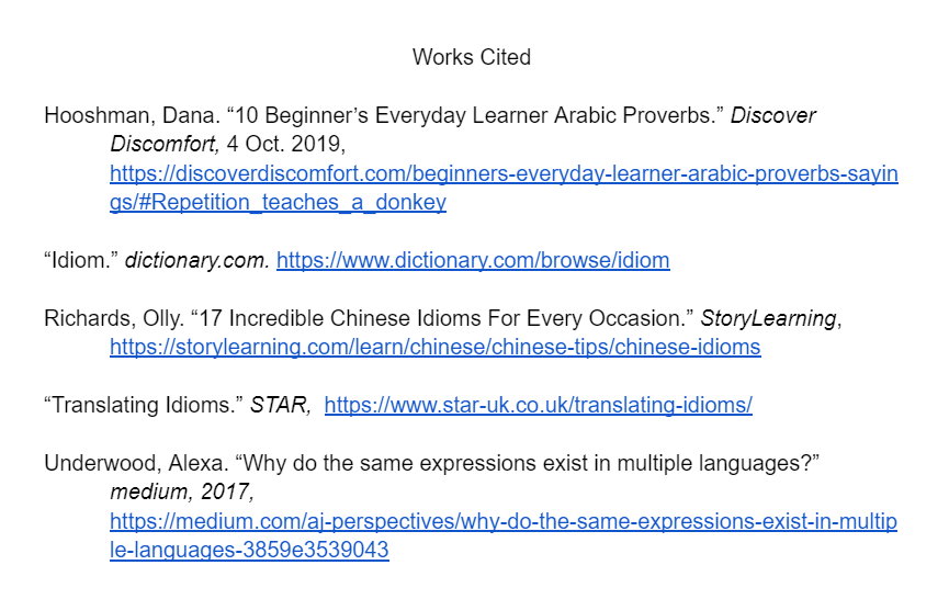 You can see how the cultures that these languages are from have uniquely influenced their idioms. Culture often influences the words used within an idiom, but their meanings come from what people experience and sometimes cultural practices. The idiom, “shed crocodile tears,” exists in at least 45 European languages, Arabic, Swahili, Persian, Chinese, Mongolian, and more (Underwood). I find it encouraging that different cultures and languages around the world share some idioms which carry the same underlying meanings because it proves the shared experiences that people around the world have had.
